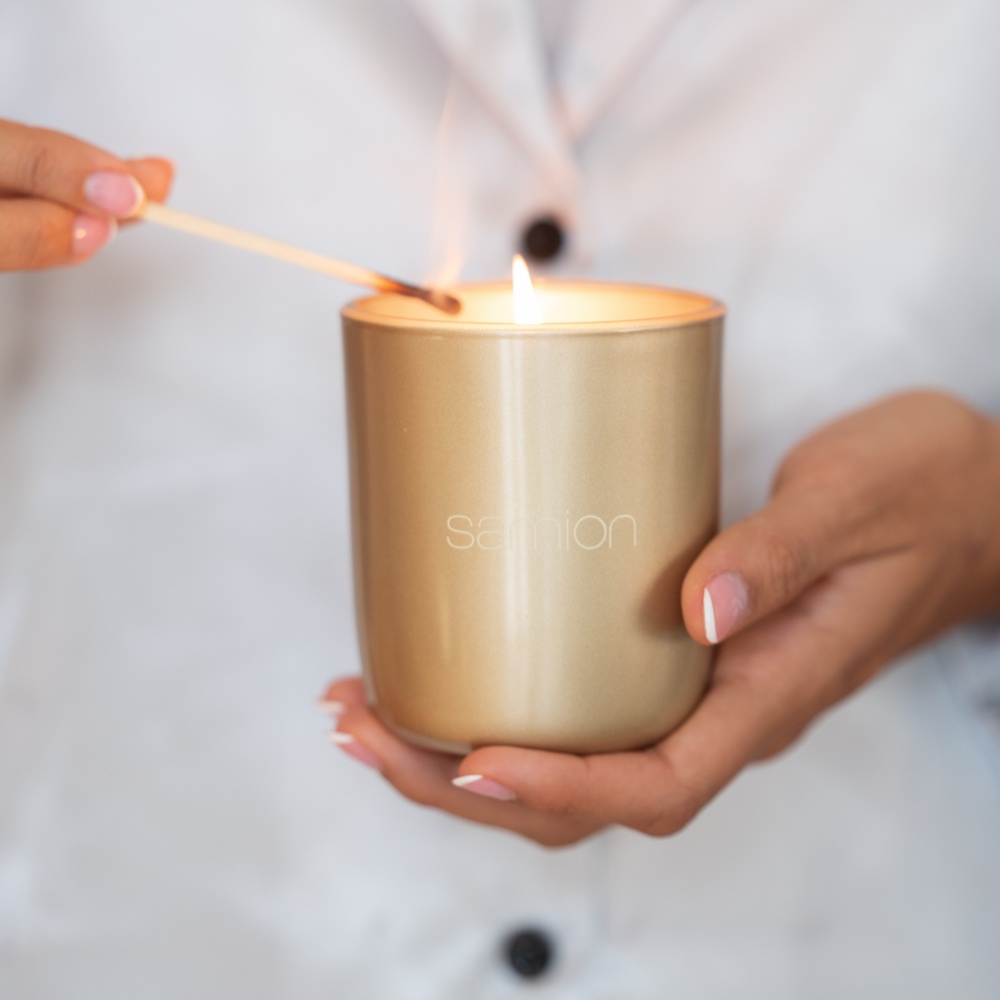 Kürze den Docht der Kerze vor jedem Anzünden auf ca. 1 cm, um ein sauberes, gleichmäßiges Abbrennen zu gewährleisten und Rußbildung zu vermeiden. Lasse die Kerze bei der ersten Anwendung so lange brennen, bis die gesamte Oberfläche flüssig ist.